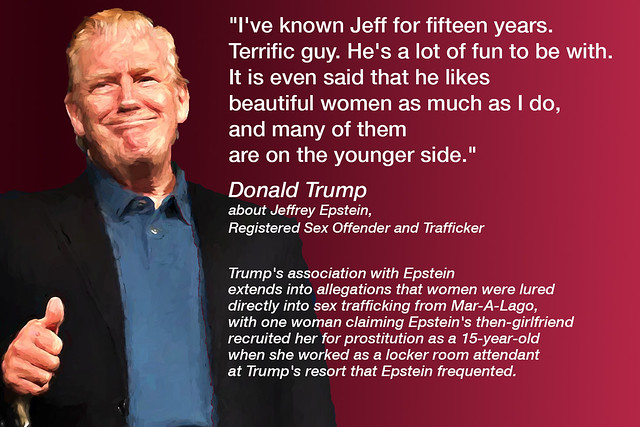Trump is desperate to distance himself from billionaire hedge fund manager, Jeffrey Epstein. Epstein is under indictment for sex trafficking and conspiracy to commit sex trafficking. The truth is that they have a history, and it involves more salacious activity by your illegitimate president.